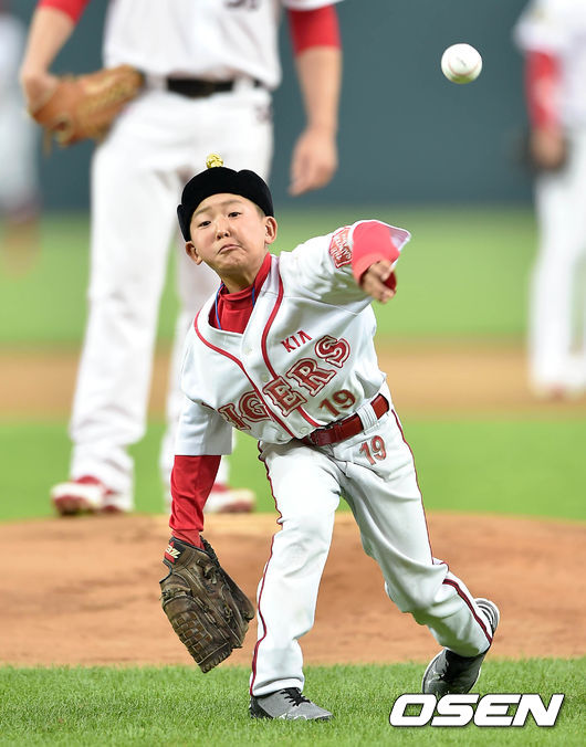 경기에 앞서 ‘타이거즈 러브펀드 데이’를 맞아 몽골 야구동아리의 투수 돌고스렌 테물렝군이 몽골 전통 모자를 쓰고 시구를 하고 있다.