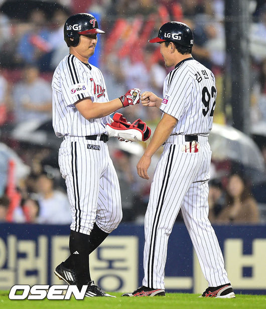 [0SEN=잠실,박준형 기자] 13일 오후 서울 잠실구장에서 열린 2014 한국야쿠르트 세븐 LG 트윈스와 SK 와이번스의 경기, 3회말 2사 1,2루 LG 이진여이 1타점 적시타를 날린후 김민호 코치와 하이파이브를 하고 있다.