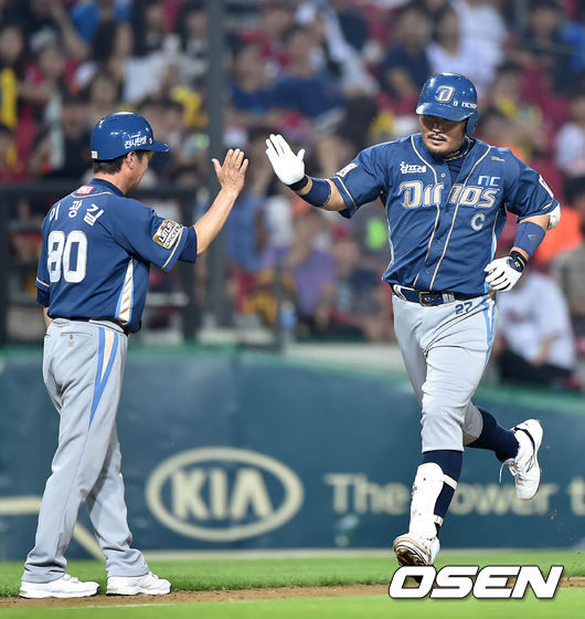 5회초 1사에서 NC 이호준이 우중월 솔로 홈런을 치고 이광길 코치와 하이파이브를 하고 있다.