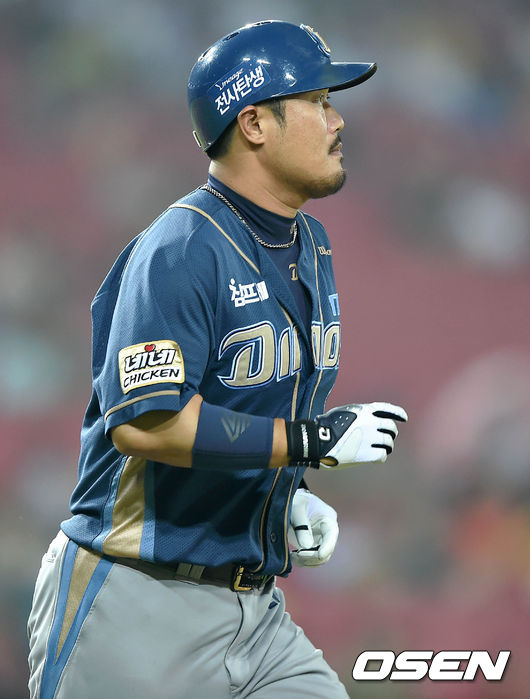 5회초 1사에서 NC 이호준이 우중월 솔로 홈런을 치고 그라운드를 바라보고 있다.