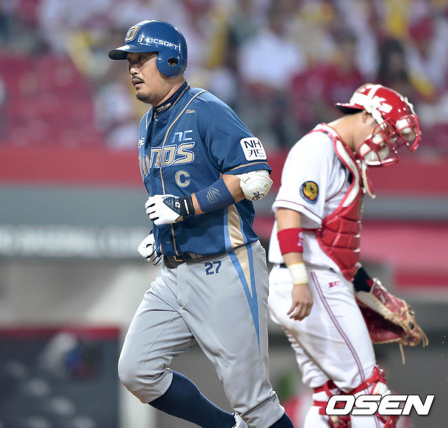 5회초 1사에서 NC 이호준이 우중월 솔로 홈런을 치고 홈을 밟고 있다.