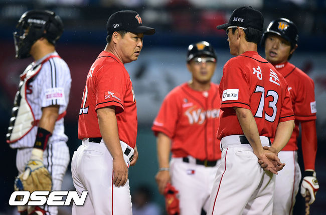 [0SEN=잠실,박준형 기자] 13일 오후 서울 잠실구장에서 열린 2014 한국야쿠르트 세븐 LG 트윈스와 SK 와이번스의 경기, 4회초 두번의 심판합의판정에 성공한 SK 이만수 감독이 성준 코치와 이야기를 나누고 있다.