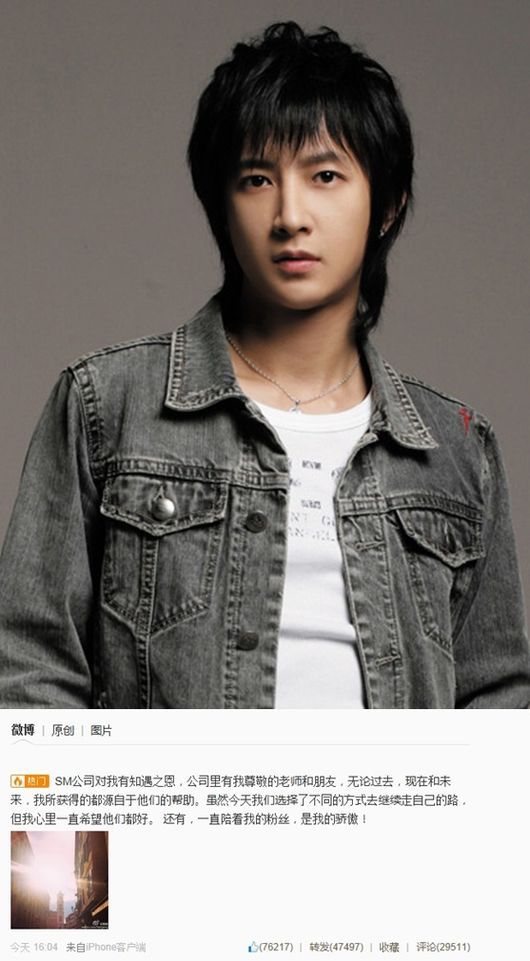 이어 "시간이 흘러도 현재와 미래, 내가 얻은 모든 것은 그들의 도움 덕분이다. 우리가 다른 길을 선택했지만 그들이 항상 잘되기를 바란다.(SM公司对我有知遇之恩,公司里有我尊敬的老师和朋友,无论过去,现在和未来,我所获得的都源自于他们的帮助。虽然今天我们选择了不同的方式去继续走自己的路,但我心里一直希望他们都好。 还有,一直陪着我的粉丝,是我的骄傲!)"며 팬들에게도 감사 인사를 전했다.