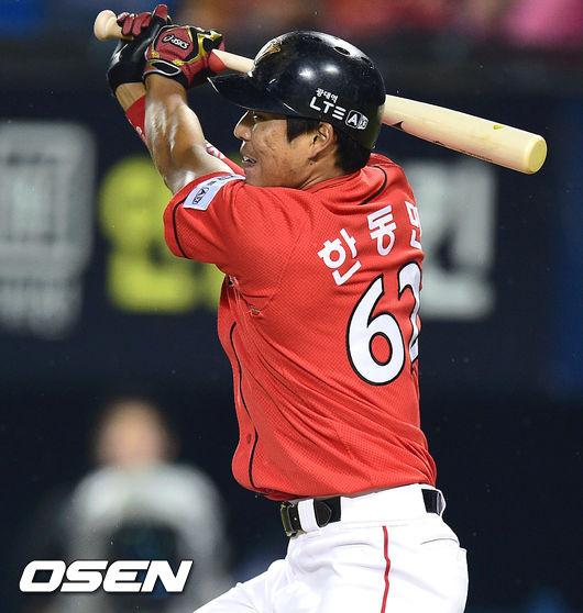 [0SEN=잠실,박준형 기자] 13일 오후 서울 잠실구장에서 열린 2014 한국야쿠르트 세븐 LG 트윈스와 SK 와이번스의 경기,4회초 1사 1,2루 SK 한동민이 역전 2타점 적시타를 날리고 있다.