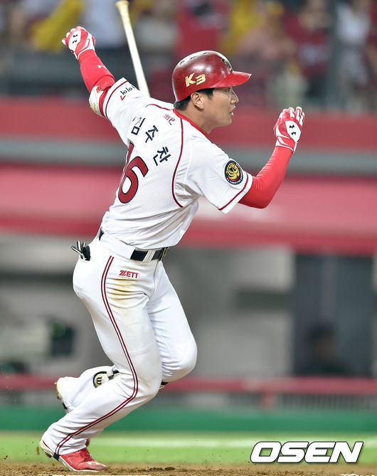 5회말 2사 1루에서 KIA 김주찬이 우중간 적시 2루타를 치고 있다.