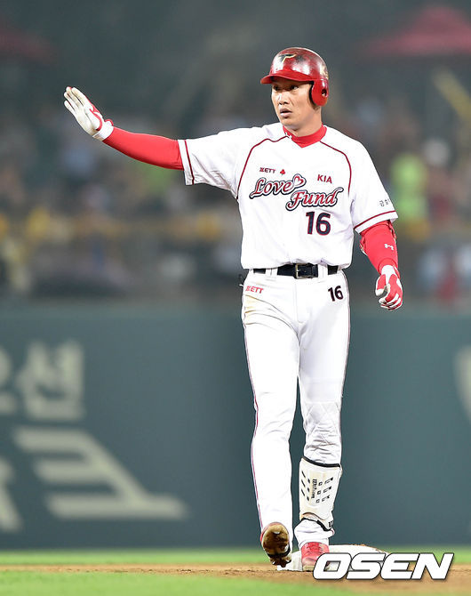 5회말 2사 1루에서 KIA 김주찬이 우중간 적시 2루타를 치고 타임을 외치고 있다.