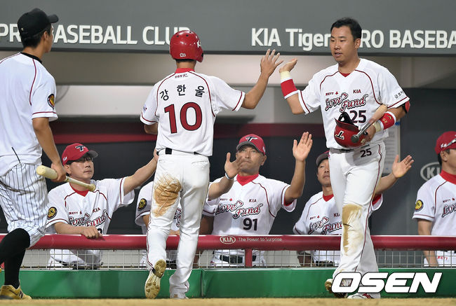 5회말 2사 1루에서 KIA 김주찬의 우중간 적시 2루타떄 홈을 밟은 1루주자 강한울이 더그아웃에서 동료들과 환호하고 있다.