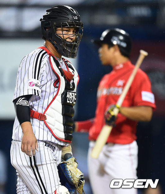 [0SEN=잠실,박준형 기자] 13일 오후 서울 잠실구장에서 열린 2014 한국야쿠르트 세븐 LG 트윈스와 SK 와이번스의 경기,4회초 블로킹 미스와 SK 한동민의 2타점 적시타로 역전을 허용한 LG 최경철 포수가 SK 더그아웃을 바라보고 있다.