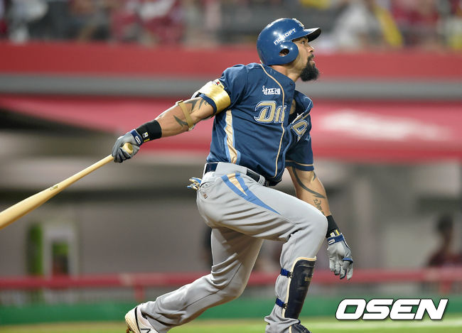6회초 1사 만루에서 NC 테임즈가 동점 희생플라이를 치고 있다.