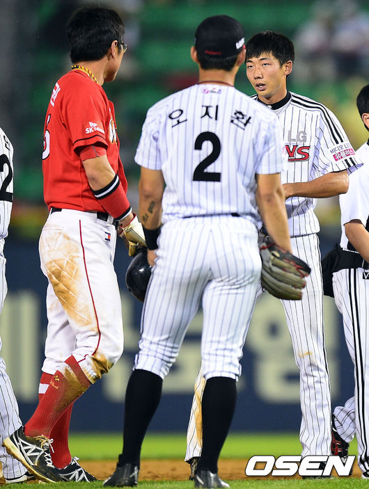 [0SEN=잠실,박준형 기자] 13일 오후 서울 잠실구장에서 열린 2014 한국야쿠르트 세븐 LG 트윈스와 SK 와이번스의 경기, 4회초 무사 1루 SK 나주환의 내야땅볼때 1루 주자 박정권을 포스아웃 시킨 김용의가 박정권의 발에 걸려넘어졌다. 박정권이 김용의에게 사과의 인사를 건네고 있다