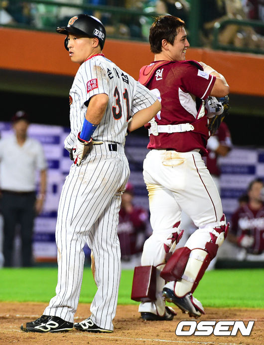 5회말 2사 1,3루 황재균의 희생플라이 아웃에 3루주자 손아섭이 홈으로 쇄도. 아웃이라는 심판 판정에 손아섭이 불만의 표정을 짓고 있다. 비디오 판독결과 손아섭 세이프.