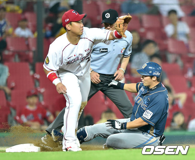 8회초 1사 2루에서 NC 나성범이 우중간 적시 3루타를 치고 3루 슬라이딩을 하고 있다.