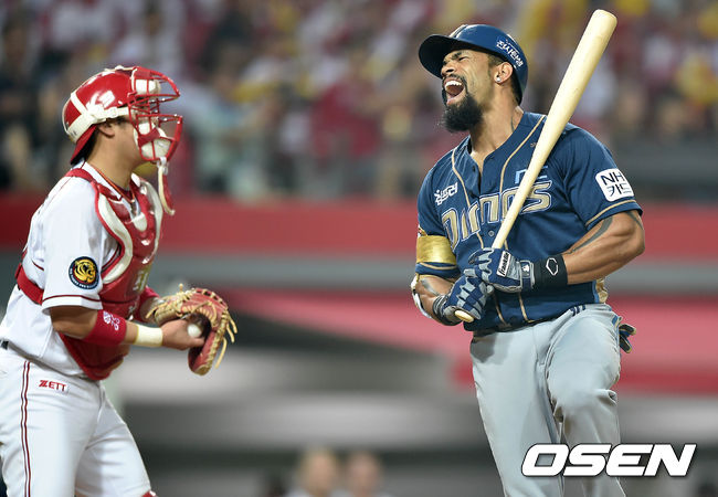 8회초 1사 3루에서 NC 테임즈가 삼진으로 물러나며 아쉬워하고 있다.