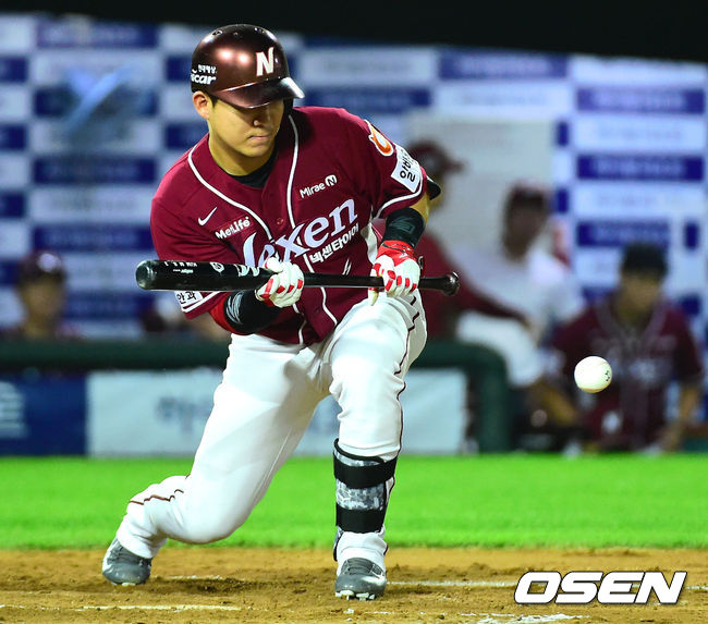 7회초 무사 1루 넥센 김민성이 희생번트를 날리고 있다.