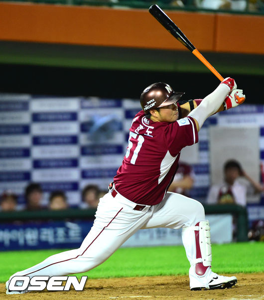 9회초 1사 2,3루 박헌도가 중견수 희생플라이를 때리고 있다.
