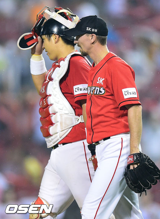 경기종료 후 SK 울프와 정상호가 승리의 기쁨을 나누고 있다. /soul1014@osen.co.kr