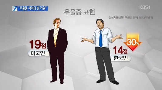 13일 삼성서울병원 정신건강의학과 전홍진 교수팀에 따르면 한국인 1592명의 우울증 표현지수는 14.58점이었고, 미국인 3744명의 우울증 표현지수는 19.95점이었다. 전홍진 교수팀은 하버드 의대 정신건강의학과 모리죠 파버 교수팀과 함께 진행한 우울증과 삶의 질을 비교 분석했다.