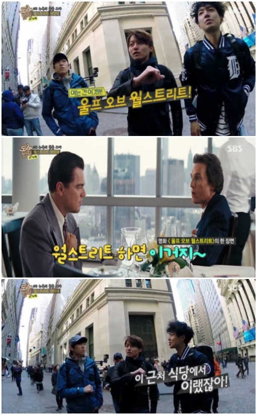 이날 정경호와 존박, 문은 월스트리트를 찾았다. 두 사람은 뉴욕 증권거래소를 보며 레오나르도 디카프리오 주연의 영화 '더 울프 오브 월스트리트'를 떠올렸다. 급기야 영화 속 한 장면을 따라했고, 서로 민망한 미소를 지었다.