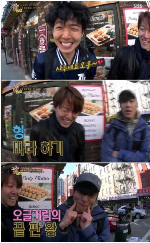 이날 정경호와 존박, 문은 맨하탄 나들이에 나섰다. 세 사람은 차이나타운에서 맛있는 음식에 시선을 빼앗겼고, 제작진과의 흥정을 시도했다. 이에 제작진은 애교를 요구했고 정경호와 문은 "사주세요"라며 귀여운 표정을 지어보였다. 자존심을 포기할 수 없다고 하던 존박 또한 검지를 양볼에 가져다 대고 '예쁜짓'을 해 웃음을 자아냈다.