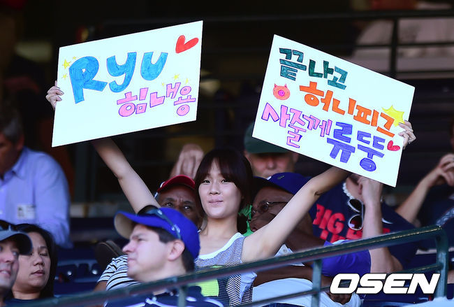 14일 (이하 한국시간) 미국 조지아 애틀랜타 터너필드에서 열린 '2014 메이저리그' 애틀랜타 브레이브스와 LA 다저스의 경기, 여성팬이 류현진을 응원하고 있다.