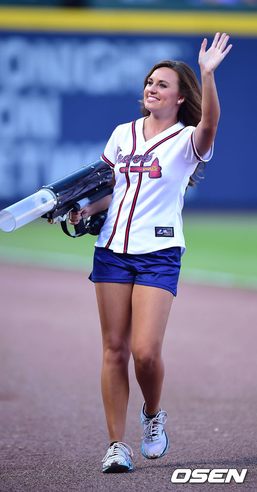 14일 (이하 한국시간) 미국 조지아 애틀랜타 터너필드에서 열린 '2014 메이저리그' 애틀랜타 브레이브스와 LA 다저스의 경기에 앞서 애틀랜타 치어리더가 팬들에게 선물을 나눠주고 있다.