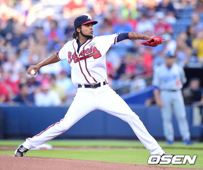 14일 (이하 한국시간) 미국 조지아 애틀랜타 터너필드에서 열린 '2014 메이저리그' 애틀랜타 브레이브스와 LA 다저스의 경기, 어빈 산타나가 힘차게 공을 던지고 있다.