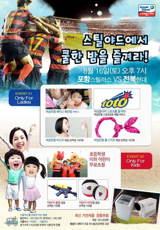 어린이 관중들을 위한 행사와 경품도 푸짐하다. 포항스틸러스는 여름 방학을 맞이하며 스틸야드를 찾는 초등학생 이하 관중들을 대상으로 무료 입장 이벤트를 실시한다. 초등학생들의 여름 더위를 날려줄 시원한 물총체험 이벤트도 준비되어 있으며, 초등학생 이하 선착순 150명을 대상으로 스틸러스 비치볼도 무료로 북문광장에서 지급할 계획이다.
