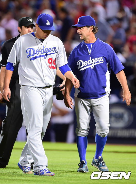 14일 (이하 한국시간) 미국 조지아 애틀랜타 터너필드에서 열린 '2014 메이저리그' 애틀랜타 브레이브스와 LA 다저스의 경기, 6회말 2사 류현진이 부상을 당한 후 매팅리 감독과 함께 마운드를 내려오고 있다.