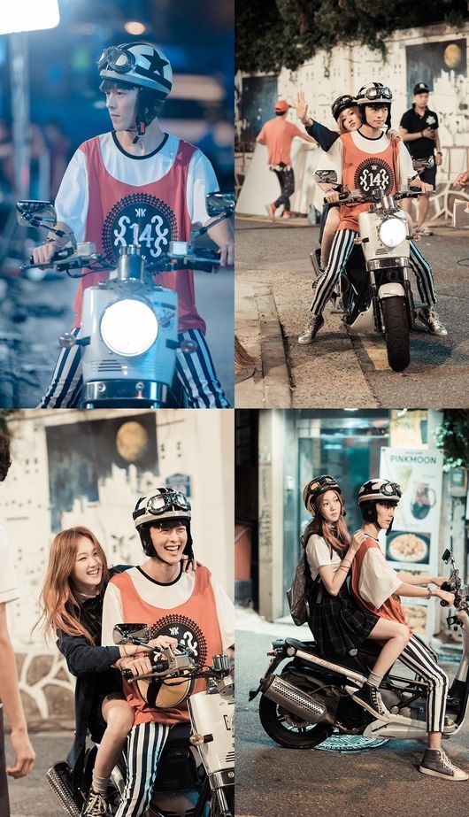 이와 관련해 공개된 비하인드컷에서 장기용은 트렌디한 의상에 오토바이 헬멧을 쓴 모습이다. 두 사람은 장난기 가득한 사랑스러운 미소로 현장 분위기를 밝혔고, 특히 장기용은 모델출신다운 8등신 프로포션을 드러내 눈길을 사로잡는다.