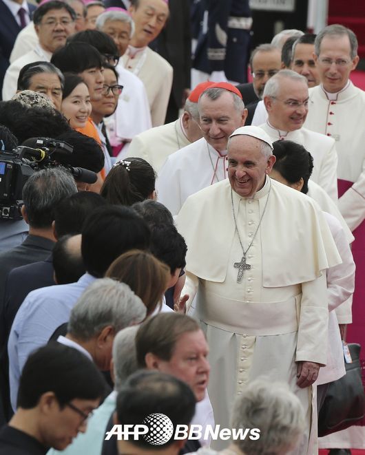 4박5일 일정으로 방한한 프란치스코 교황은 이날 11시간이 넘는 장기간의 비행에도 불구하고 온화한 미소를 지어보였다. 박근혜 대통령이 "교황 방한 계기로 따뜻한 위로가 전해지고 분단과 대립의 한반도에 평화와 화해의 시대가 열리길 바란다"고 직접 영접하며 말하자 교황은 "마음 속에 깊이 간직하고 왔다"고 화답했다.