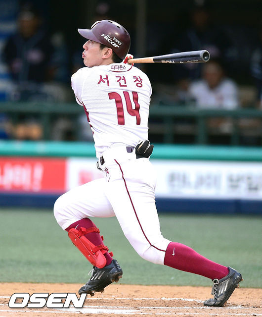 14일 오후 서울 목동구장에서 열리는 2014 한국야쿠르트 세븐 프로야구 넥센 히어로즈와 두산 베어스의 경기,1회말 넥센 선두타자 서건창이 선취 홈런을 날리고 있다.