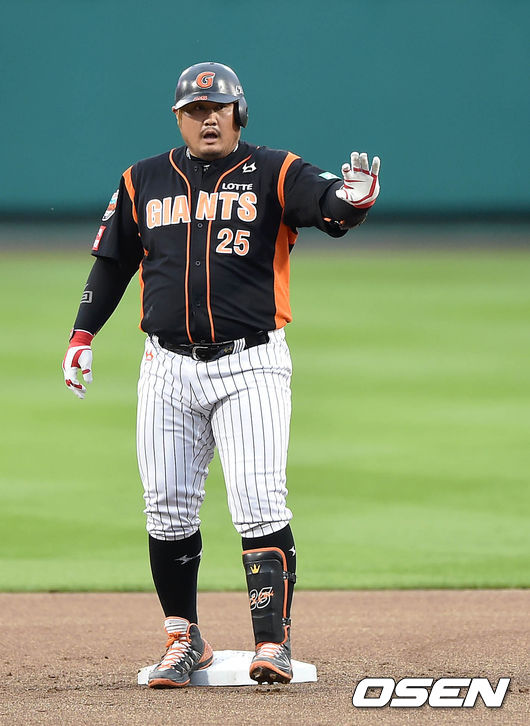 1회초 2사 2루에서 롯데 최준석이 중전 적시타를 치고 타임을 외치고 있다.