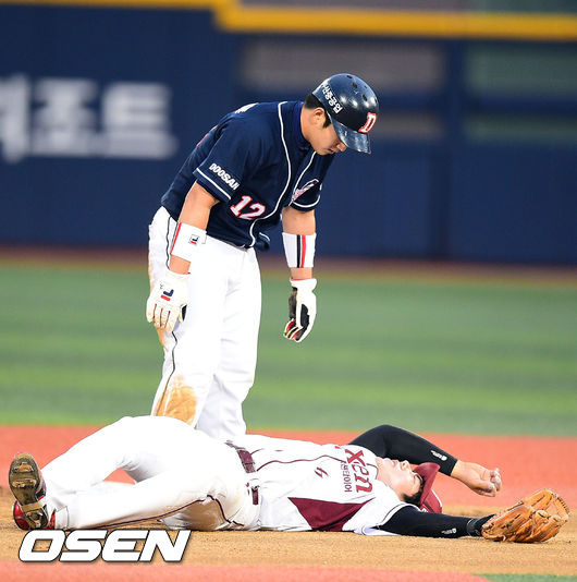 14일 오후 서울 목동구장에서 열리는 2014 한국야쿠르트 세븐 프로야구 넥센 히어로즈와 두산 베어스의 경기,3회초 무사 1루 두산 김재호의 내야땅볼때 넥센 강정호가 1루 주자 최재훈과 충돌 후 쓰러져 있다.