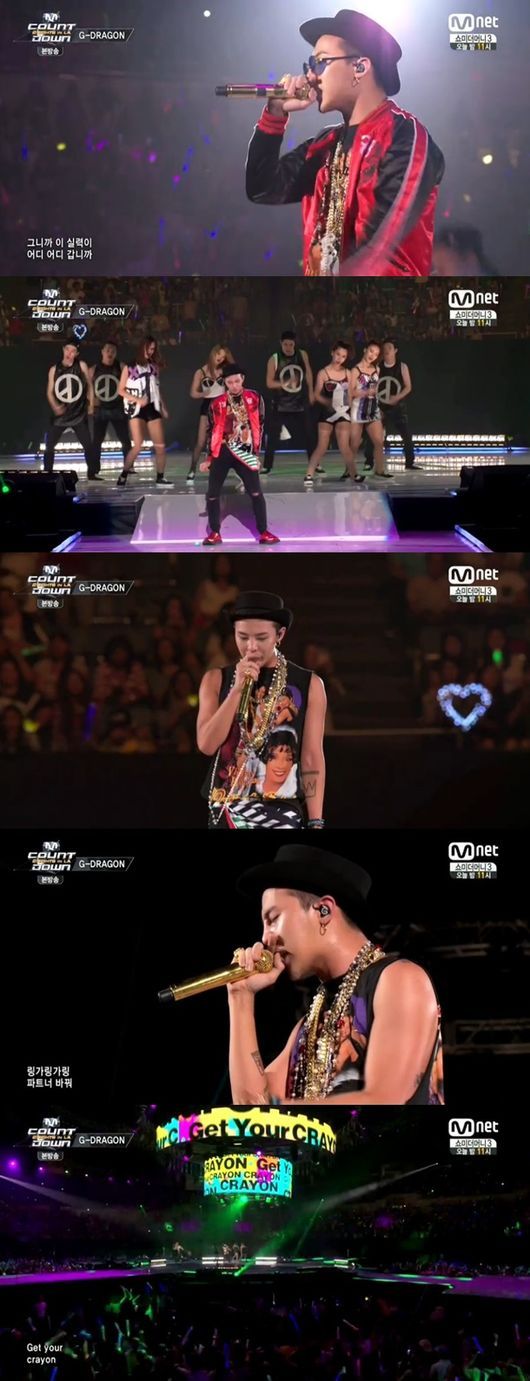 지드래곤은 14일 오후 방송된 Mnet '엠카운트다운'에서 '원 오브 카인드(ONE OF KIND)' '삐딱하게' '크레용' 등의 무대를 연달아 꾸몄다.