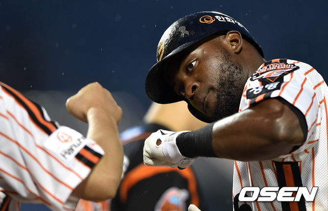 3회말 2사 1,2루에서 한화 피에가 우전 적시타를 치고 환호하고 있다.