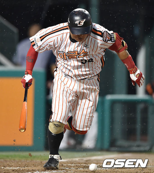 3회말 1사 1,2루에서 한화 김태균이 자신의 타구가 발에 맞고 아웃되고 있다.