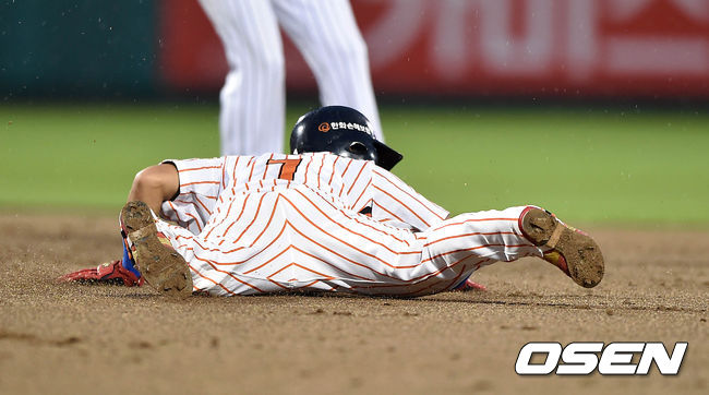 3회말 1사 1루에서 한화 송광민의 안타때 1루주자 이용규가 타구를 피하다 넘어지고 있다.