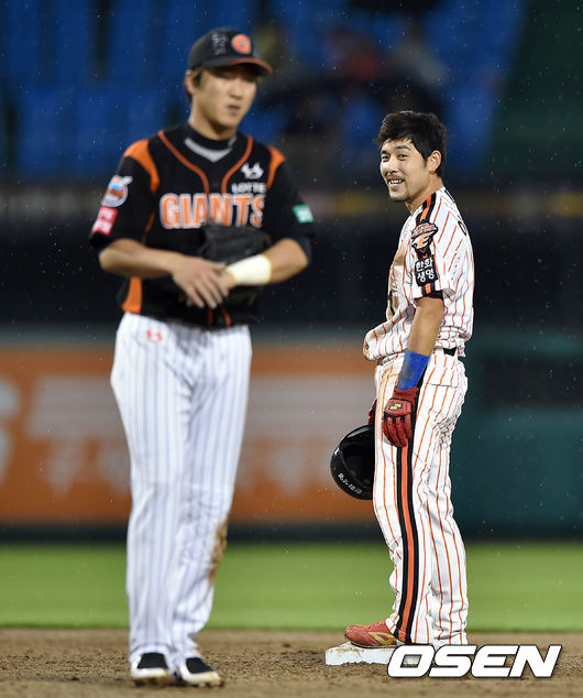3회말 1사 1루에서 한화 송광민의 안타때 타구를 피하다 넘어졌던 1루주자 이용규가 미소를 짓고 있다.