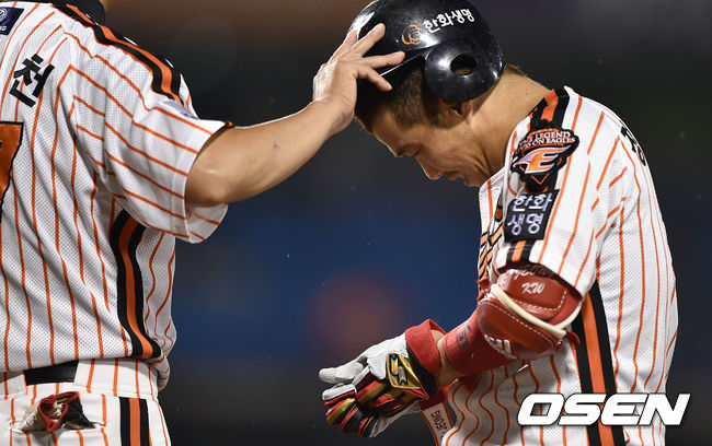 4회말 2사 1루에서 한화 강석천 코치가 외야플라이로 물러난 정근우의 렣멧을 벗겨주고 있다.