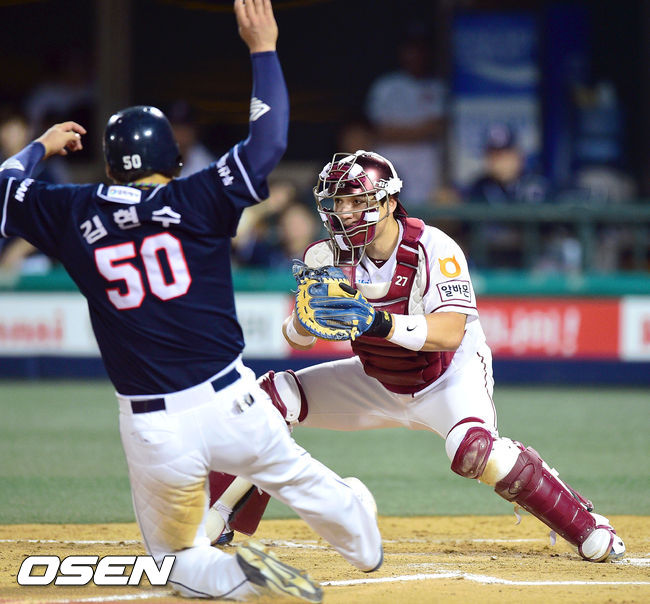 14일 오후 서울 목동구장에서 열리는 2014 한국야쿠르트 세븐 프로야구 넥센 히어로즈와 두산 베어스의 경기,3회말 1사 만루 두산 최주환의 내야땅볼때 넥센 박동원 포수가 3루 주자 김현수를 포스아아웃시키고 있다.