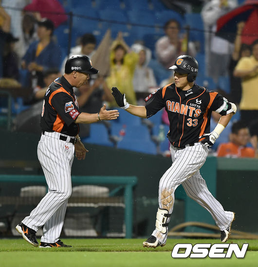 5회초 2사에서 롯데 정훈이 우월 솔로 홈런을 치고 모토니시 코치와 하이파이브를 하고 있다.