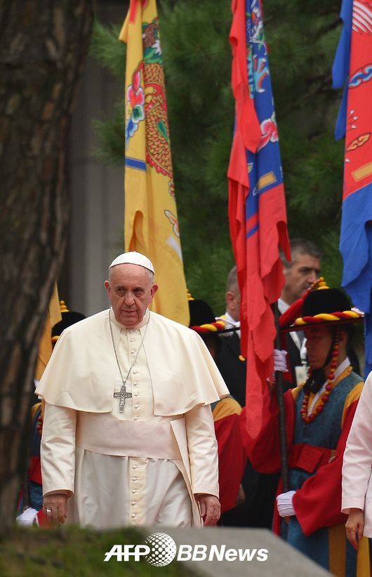 4박5일 일정으로 방한한 프란치스코 교황은 이날 11시간이 넘는 장기간의 비행에도 불구하고 온화한 미소를 지어보였다. 직접 영접한 박근혜 대통령이 "교황 방한 계기로 따뜻한 위로가 전해지고 분단과 대립의 한반도에 평화와 화해의 시대가 열리길 바란다"고 말하자 교황은 "마음 속에 깊이 간직하고 왔다"고 화답했다.