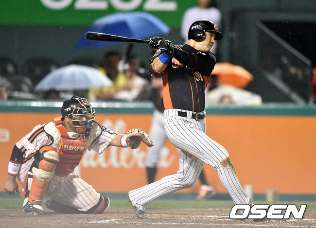 6회초 무사 1,3루에서 롯데 박종윤이 중전적시타를 치고 있다.
