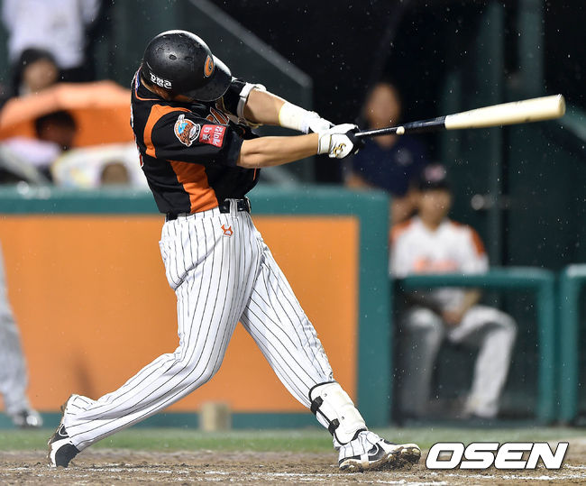 6회초 2사 만루에서 롯데 정훈이 좌전 2타점 적시타를 치고 있다.