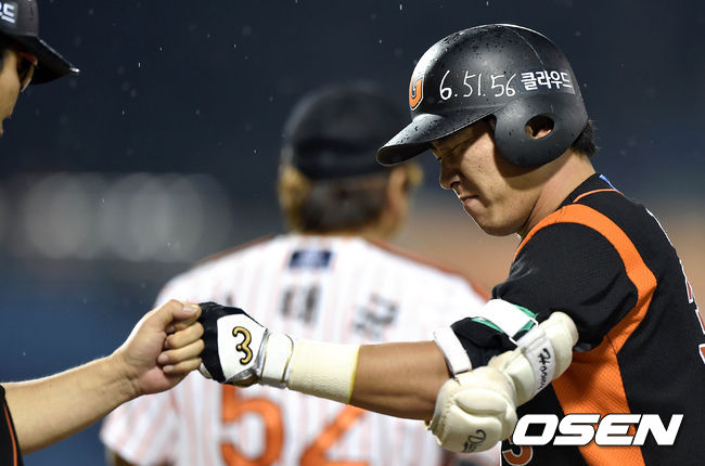 6회초 2사 만루에서 롯데 정훈이 좌전 2타점 적시타를 치고 김응국 코치와 하이파이브를 하고 있다.