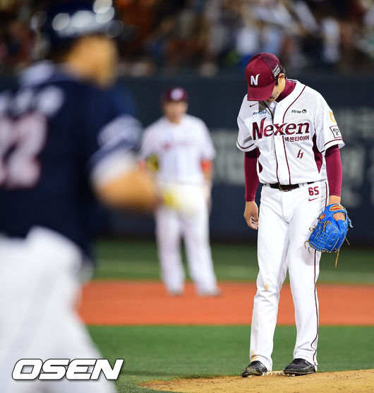 14일 오후 서울 목동구장에서 열리는 2014 한국야쿠르트 세븐 프로야구 넥센 히어로즈와 두산 베어스의 경기, 6회초 1사 2루 두산 홍성흔에게 2점 홈런을 허용한 넥센 선발투구 김대우가 아쉬워하고 있다