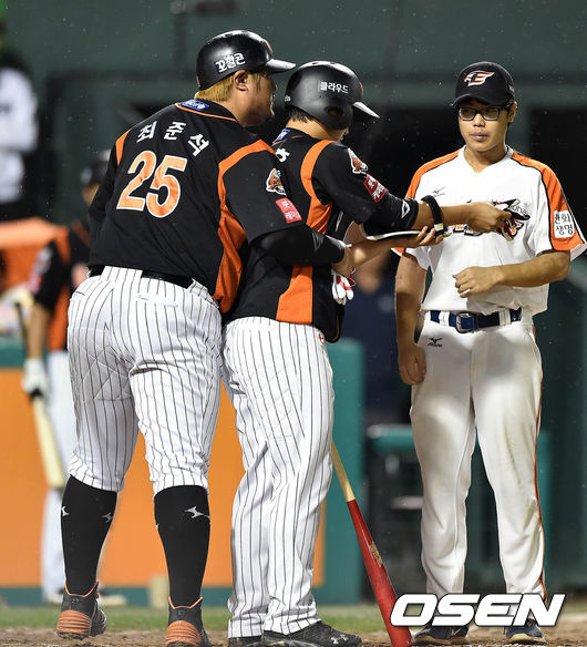 6회초 2사 만루에서 홈을 밟은 3루주자 최준석이 몸에 맞는 볼로 출루하는 하준호를 격려하고 있다.