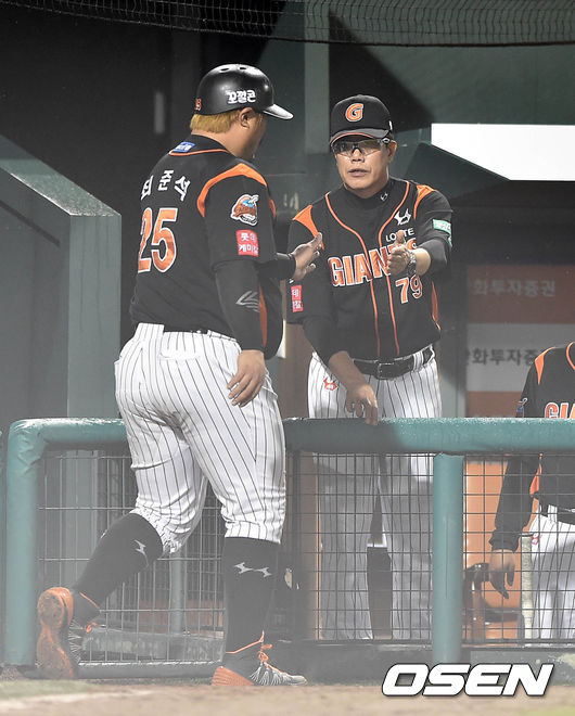 7회초 무사 3루에서 롯데 박종윤의 희생플라이때 홈을 밟은 3루주자 최준석이 더그아웃에서 김시진 감독과 하이파이브를 하고 있다.
