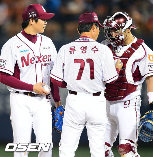 14일 오후 서울 목동구장에서 열리는 2014 한국야쿠르트 세븐 프로야구 넥센 히어로즈와 두산 베어스의 경기, 7회초 넥센 선발투수 김대우가 교체되고 있다.
