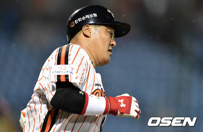 7회말 무사에서 한화 조인성이 좌중월 솔로 홈런을 치고 그라운드를 돌고 있다.